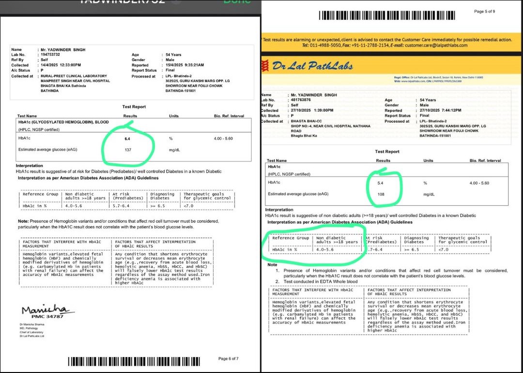 Struggled with low energy, rising sugar levels, and declining health confidence. After correcting daily lifestyle habits, HbA1c improved from ~6.8% to ~5.4%, cholesterol reduced (~240 → ~185 mg/dL), energy levels came back, and confidence in managing his health improved significantly.